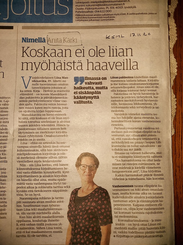 LIISA MANSIKKAVIIDAN omakustannekirjasta - Hetkiä ja mietteitä elämästä, julkaistu Keskisuomalaisessa 17.11.2020